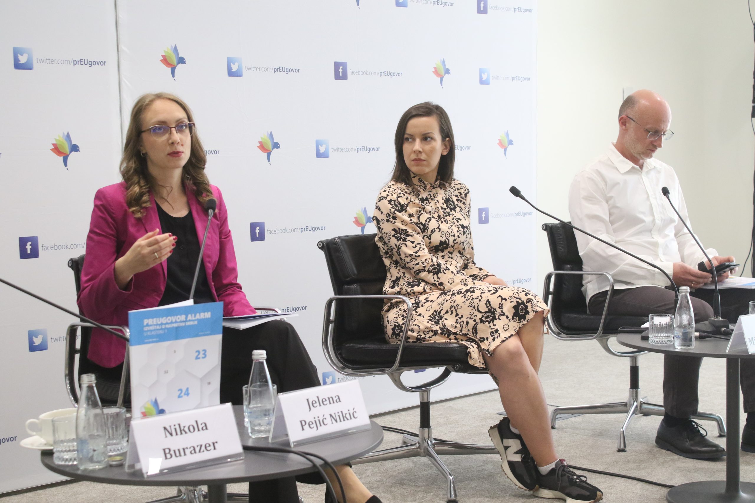 Jelena Pejić Nikić, urednica izveštaja Koalicije prEUgovor i istraživačica Beogradskog centra za bezbednosnu politiku (BCBP), izjavila je da su izveštajni period od novembra do aprila obeležili su izbori što znači i zastoj u formalnim aktivnostima ukoliko njih treba da sprovede izvršna i zakonodavna vlast.