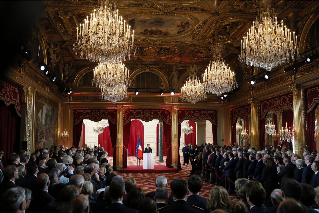 Očekuje se da će se novi predsednik Francuske obratiti okupljenima na prijemu u Palati, u prisustvu oko 300 visokih zvanica.