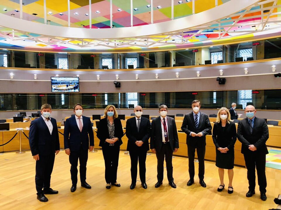 Evropski poslanici sa komesarom Varheljijem nakon sporazuma; Foto: Twitter /@TPicula