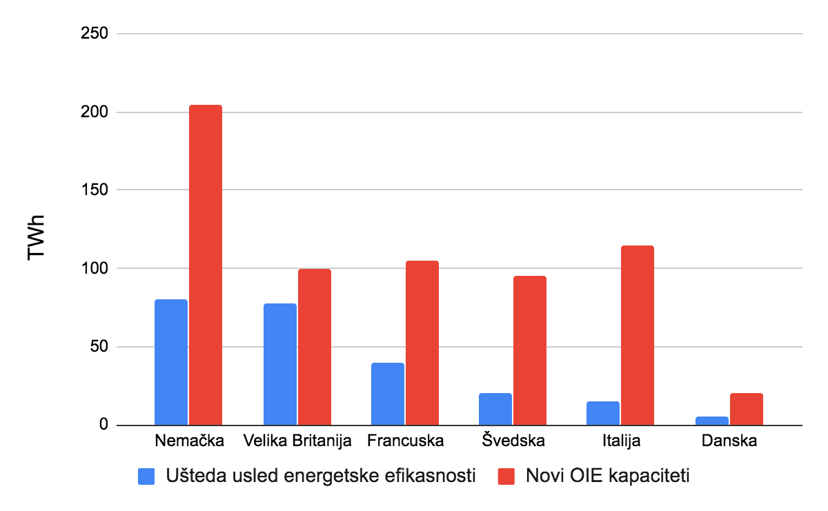 Drugo, primena mera energetske efikasnosti ključna je za dostizanje ciljeva u oblasti OIE, pre svega posmatrano sa aspekta procenjenih ulaganja u toj oblasti. Mere treba da smanje bruto finalnu potrošnju energije iz neobnovljivih izvora. I u ovom slučaju finansijski podsticaji za energetsku efikasnost igraju značajnu ulogu.