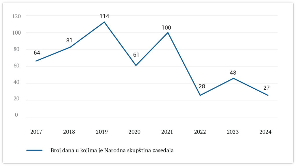 Od 2022, kada se opozicija vratila u parlament, kao da je neko odlučio da se, od sada, parlament sastaje samo ako baš mora. Godine 2023. je bilo nešto više radnih dana od 2022. i 2024. zbog masakara u Ribnikaru i Mladenovcu. Sednica na tu temu je ujedno bio i jedini ustupak vlasti demonstrantima tokom tog ciklusa protesta.