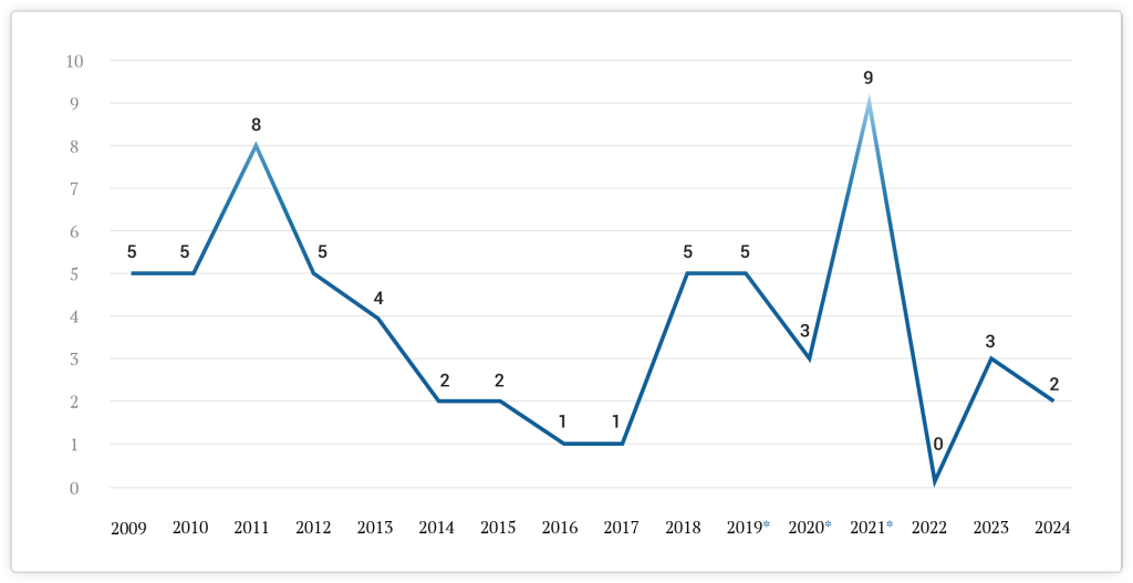 Čak i za standarde vladavine Srpske napredne stranke, ovako retko zasedanje parlamenta poslednje dve godine je negativan rekord. Na grafikonu ispod se vidi da je u periodu 2017-2019. parlament zasedao dva ili čak tri puta češće nego u periodu 2022-2024. Po sadašnjem trendu, ni 2025. neće biti mnogo bolja od prethodne, ako uopšte bude bolja.