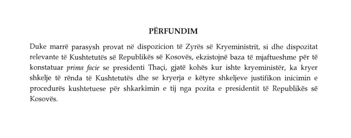 „Uzimajući u obzir dokaze kojima raspolaže Kabinet premijera, kao i relevantne odredbe Ustava Republike Kosovo, postoji dovoljan osnov za prima facie zaključak da je predsednik Tači, u vreme kada je bio premijer, počinio ozbiljno kršenje Ustava, kao i da izvršenje ovih povreda opravdava pokretanje ustavne procedure za njegovo razrešenje sa mesta predsednika Republike Kosovo“, zaključio je Kurti.
