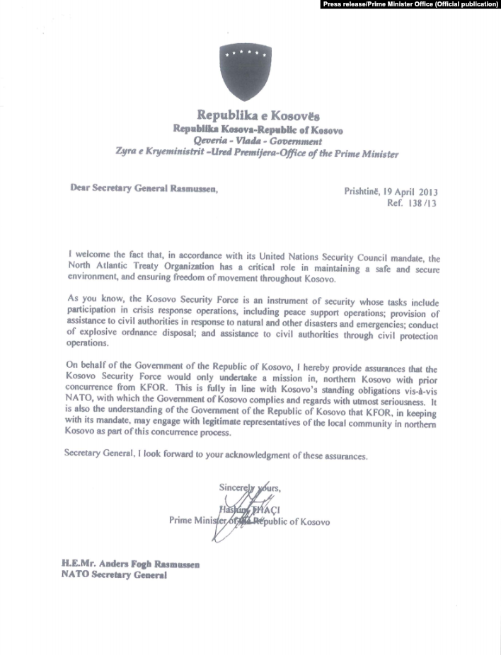 U pismu koje je 2013. potpisao Tači, a koje je objavila Kancelarija premijera Kosova, Tači uverava Razmusena da će „Kosovske bezbednosne snage sprovoditi misije na severu Kosova samo uz prethodnu saglasnost KFOR-a“.