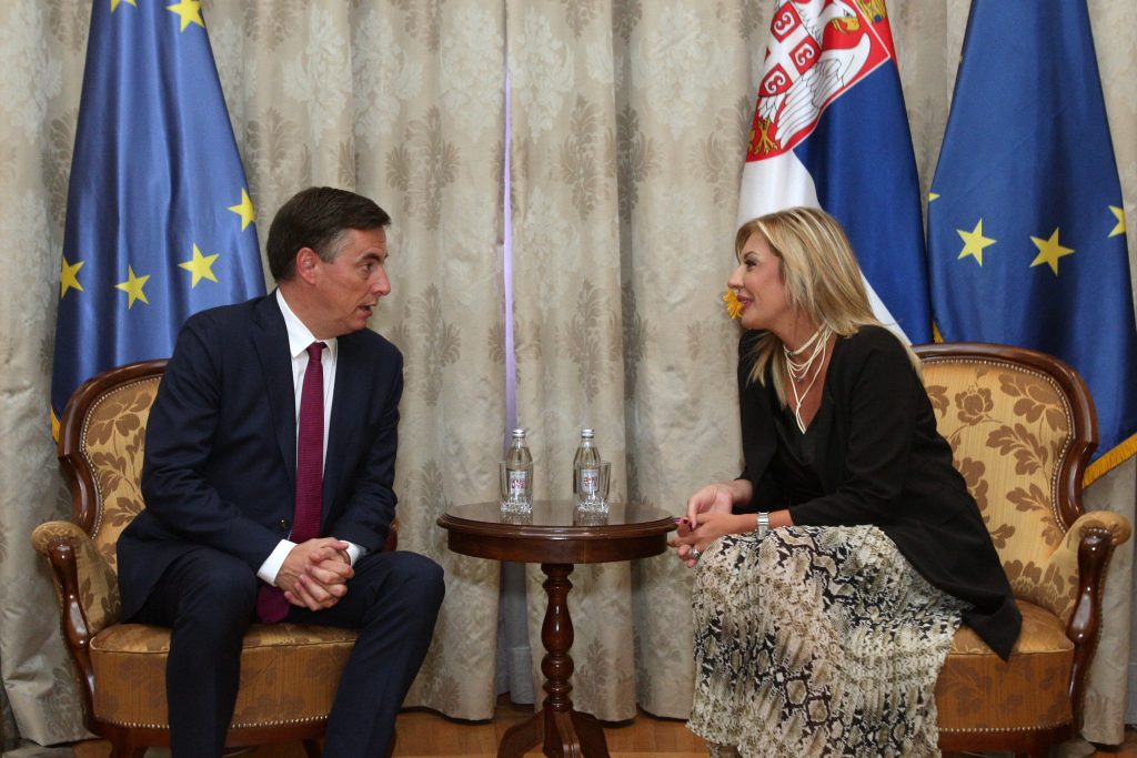 Mekalister je prethodno imao sastanak sa šefom Delegacije Evropske unije u Srbiji Semom Fabricijem, da bi se potom sastao i sa ministarkom za evropske integracije Jadrankom Joksimović.