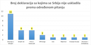 Pored ovih dekleracija Srbija se nije uskladila sa jednom deklaracijom EU koja se tiče DR Kongo, a verovatni razlog je taj što je ta zemlja glasala protiv pristupanja Kosova Unesku. Zanimljivo je i to što Srbija u 2018. godini nije podržala dekleraciju koja se tiče Venecuele, a autori analize takođe ovo objašnjavaju činjenicom da Venecuela podržava stav Srbije po pitanju Kosova u međunarodnim organizacijama.