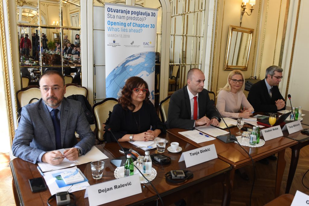 Potpredsednica Radne grupe za poglavlje 30 Ministarstva trgovine Tatjana Dinkić pojasnila je da se to poglavlje sastoji od zajedničke trgovinske i investicione politike i obuhvata regulisanje prometa robe dvostruke namene, izvoznih kredita i razvojne i humanitarne pomoći.