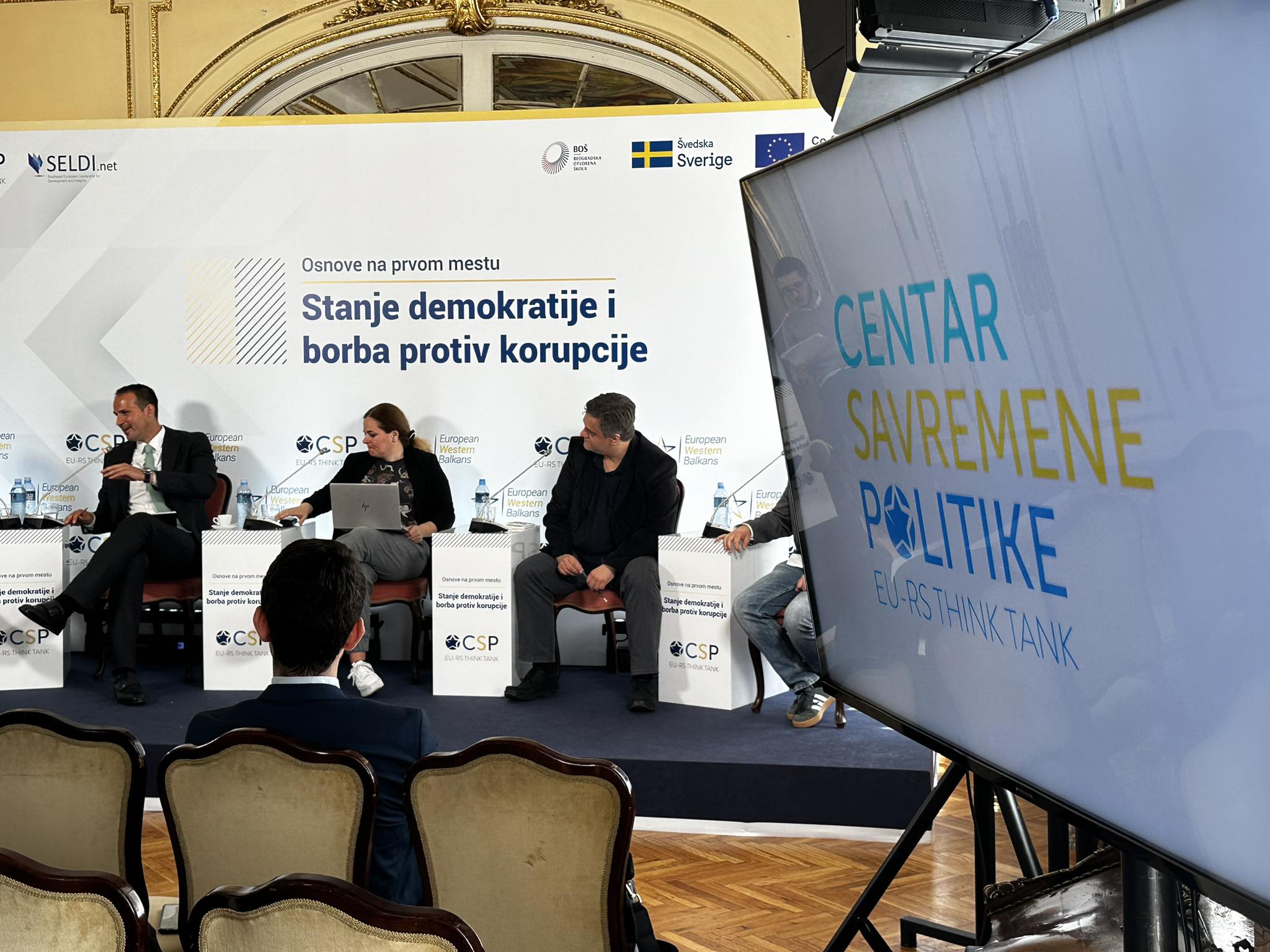 Na konferenciji su predstavljeni rezultati istraživanja javnog mnjenja iz Izveštaja o proceni korupcije u Srbiji za 2023. godinu, koji je objavio Centar savremene politike u okviru Seldi mreže.
